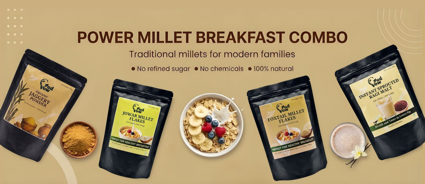 Shop our range of 2-in-1 millet combos made for everyday health. Each pack includes two carefully chosen products like millet flakes, sprouted ragi, dosa mix, or jaggery powder – perfect for a healthy breakfast, snack, or meal. Natural, easy to use, and full of nutrients. Great for kids, adults, and families.
